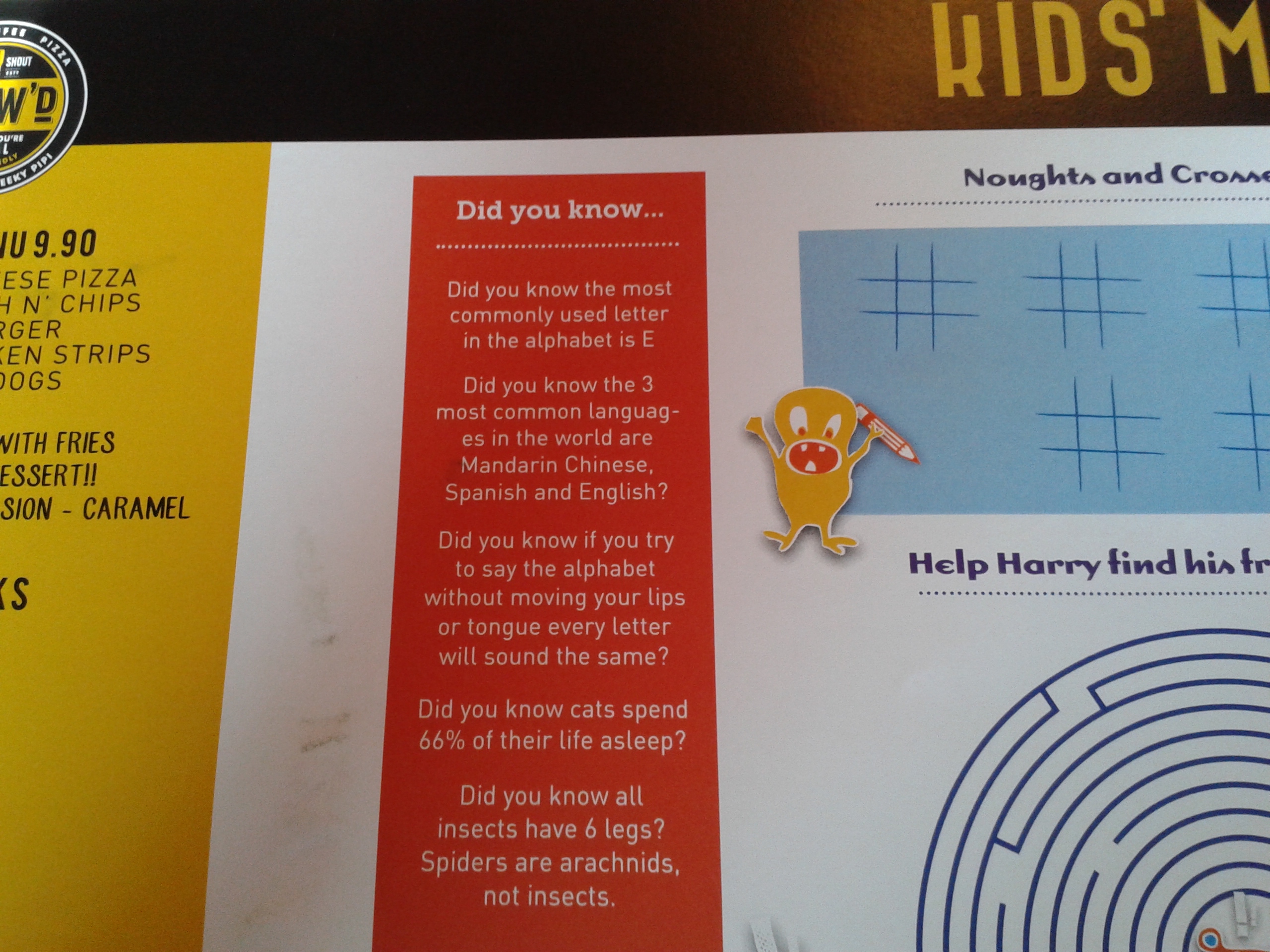 We’re not advertising for Brew’d, but this amusing “Did you know…” popped up on their Kids’ Menu recently 🙂 The first is probably from sheer numbers of population! 😉 and the latter two, colonisation?