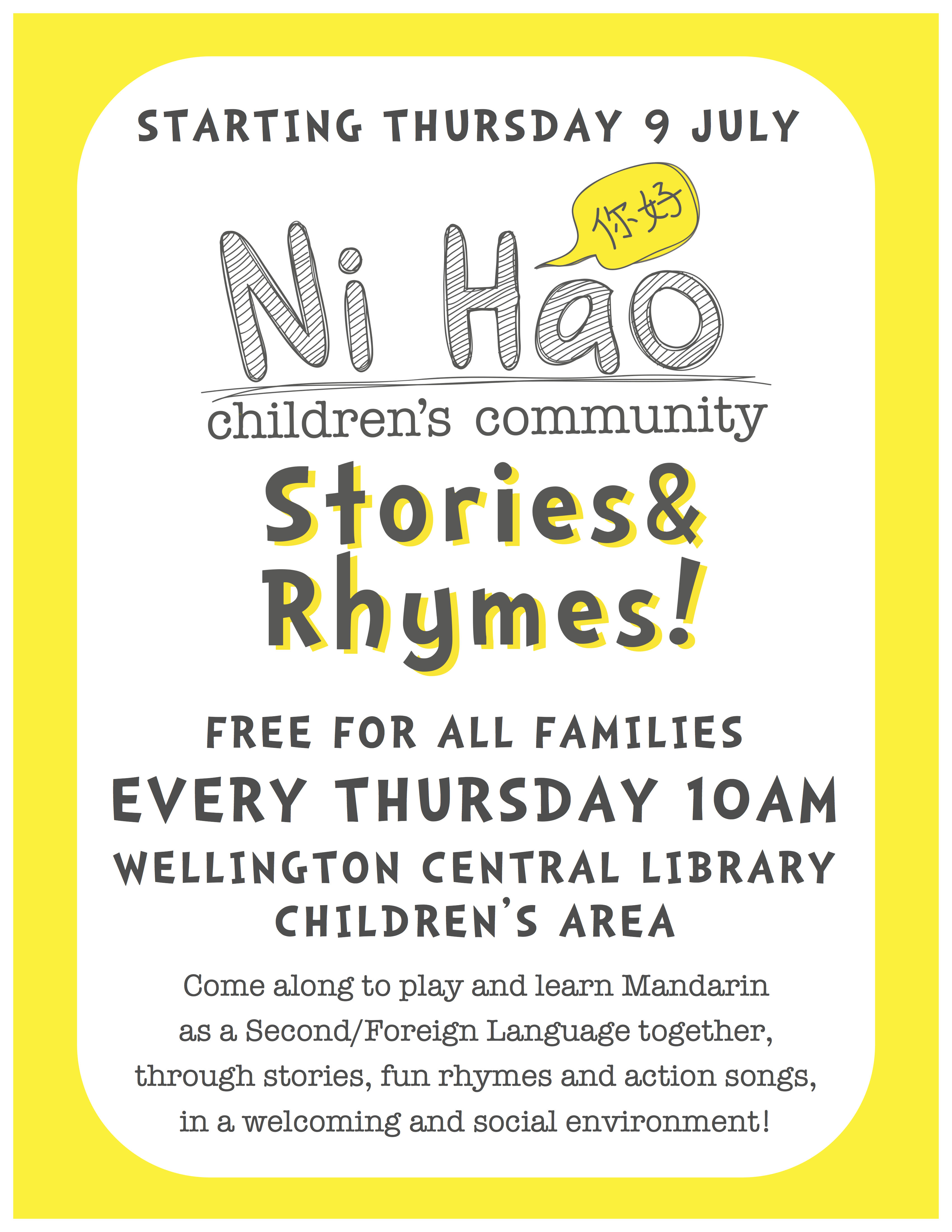 The first Stories&Rhymes! session will be held tomorrow 10am-10:30am at Wellington Central Library 🙂 Come along for some common English children’s songs – in Mandarin! – and a story or two…